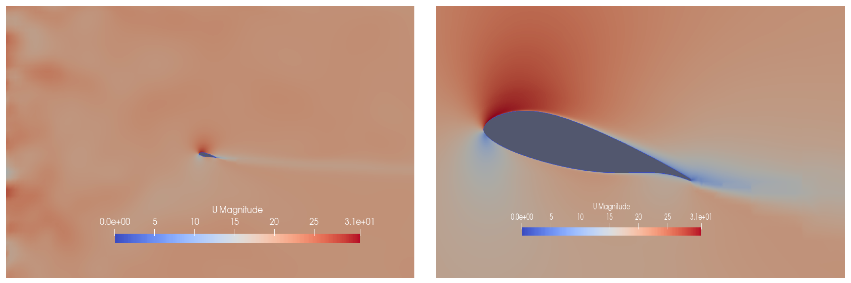 - The CFD code delivers well in benchmarking against the wind tunnel results of the NLF airfoil at conditions AoA = , Mach = 0.1 and Re = . Although the kOmegaSSTLM turbulence model satisfactorily reproduces the experimental finding in 2D simulations, the IDDES model for the 3D cases around the wing is chosen since the latter does not predict but simulates the transition. In the current work, definite evidence is produced that the IDDES model can identify the transition (emergence of instabilities) even for industrial applications with relatively coarse meshes and high time steps for light aircrafts at low speeds.