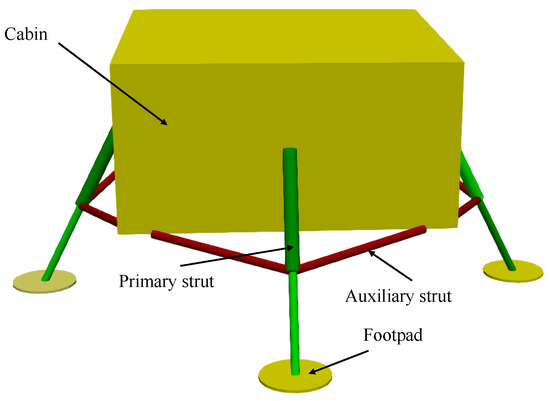 Figure 1 illustrates the structural schematic of a legged lander, which consist of the main lander body and four sets of landing leg. Each leg assembly comprises a primary damping strut, two auxiliary damping strut, and a footpad. In this paper, the cabin is recognized as a rigid body, and the struts are modeled using the Euler-Bernoulli beam. Additionally, the Kirchhoff thin plate is adopted to describe the footpad.