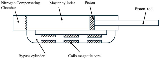 where represents the length of the bypass cylinder, d is the width of the gap between the magnetic core and the bypass cylinder, represents the viscosity of the MR fluid, , and , are the equivalent length and inner diameter of the connecting cylinders, respectively. and represent the length and inner diameter of the master cylinder, respectively. v is the cushioning velocity of the damper.