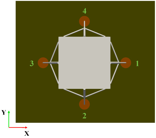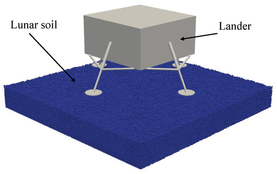 To verify the correctness of the FMBD-DEM coupling model, the landing process of the lunar lander from literature [37] is simulated within the proposed framework. The lander has an initial vertical impact velocity of −6.2 m/s and a total mass of 3000 kg. A schematic of the lander’s structure is shown in Figure 9. The lunar regolith is modeled using spherical particles with a radius of 2 cm. The material properties assigned to these particles are listed in Table 1.
