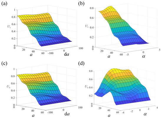 Based on the above concept, the inputs of the fuzzy controller are selected as the vehicle’s acceleration a, the rate of change of acceleration , and the pitch and roll angles , . According to the literature, during the landing process, the maximum impact acceleration of the lander does not exceed 5 g, and its pitch and roll angles remain within 4°. Therefore, the range of and is set as degree. Additionally, the range of jerk is selected as . The control voltages , , , are selected as the output of the controller to adapt the damping force , , , , and their ranges are . Figure 3 gives the indices of the footpads. Four fuzzy sets are defined for acceleration a, namely Zero, Small, Medium, and Big, corresponding to the linguistic variables {Z, S, M, B}. For the jerk , two fuzzy sets are defined: Zero and Big, denoted as {Z, B}. For pitch angle and roll angle , three fuzzy sets are defined: Negative, Zero, and Positive, represented by the set {N, Z, P}. As for the voltage output U, seven fuzzy sets are introduced: Zero, Small, Small-Medium, Medium, Small-Big, Medium-Big, and Big, corresponding to the set {Z, S, SM, M, SB, MB, B}. Fuzzy inference is performed using the Mamdani method, and defuzzification is carried out using the centroid method. The relationships between the input and output variables are shown in Figure 4.