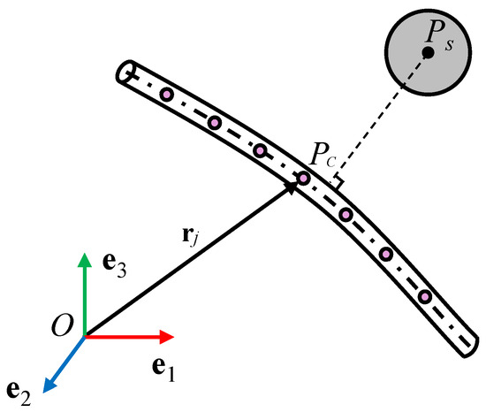 The diagram of sphere-beam contact detection is shown in Figure 5. Denoting the particle’s global position as , and its rotation matrix as . The two nodes of the beam are marked as and , respectively, and they can be expressed as follows: