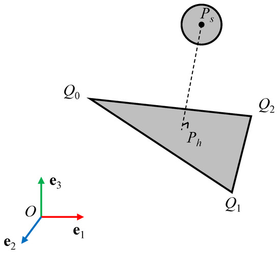 By solving Equation (29), one can obtain the values of . The potential contact interaction between the sphere and the triangular facet can be identified by evaluating the sign of , and the global position of the closest projection point P can be formulated as follows:
