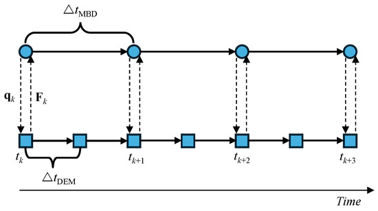 In the coupled simulation, the discrete element method (DEM) solver begins to advance using time-step , proceeding through n steps to reach the synchronization point. Then, the multibody dynamics solver starts with the time-step . At the synchronization, the two solvers exchange displacement and contact force information. Specifically, the motion information of the flexible multibody system is transferred to the DEM solver as a boundary condition, while the contact forces computed by the DEM solver are fed back to the flexible multibody system.