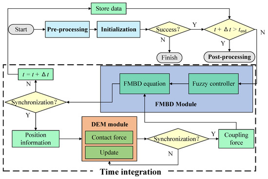 Finally, the simplified computational flowchart for the FMBD–DEM coupling model is shown in Figure 8.