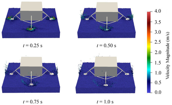 Figure 10 illustrates the contours which show the state of the interaction between the lander and the lunar soil at different moments, in which different colors indicate the magnitude velocity of the particles. It can be clearly observed that at s, the lander’s footpad interacts with the lunar soil particles, transferring part of the landing energy to the granular medium and resulting in a sharp change in particle velocities. Subsequently, collisions and friction between particles lead to the gradual transfer and dissipation of kinetic energy. As a result, the disturbed region expands over time, while particle velocities decrease, as shown in Figure 10.