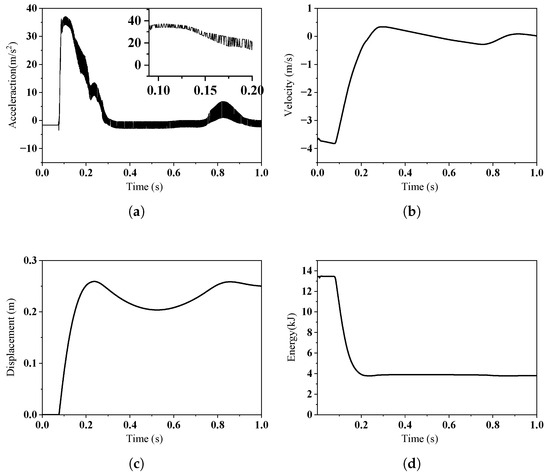 The dynamic characteristics of the lunar lander when landing on the lunar soil are shown in Figure 11. Figure 11a presents the time history of lander acceleration during the landing process. It can be observed that, due to the presence of the magnetorheological (MR) damping system, the lander’s acceleration is actively regulated, resulting in oscillations. The peak acceleration is within the allowable design range. Figure 11b shows the variation of the lander’s velocity over time. Under the effect of the damping system, the velocity gradually decreases to zero, indicating a successful and stable landing. The lander’s descent height is depicted in Figure 11c, with a maximum value of 0.35 m. Figure 11d illustrates the variation of the lander’s mechanical energy throughout the landing process.