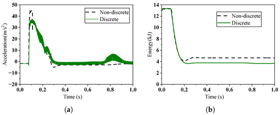 The dynamic characteristics of the landing system using discrete and non-discrete lunar soil: (a) Comparison of the lander’s acceleration. (b) Comparison of the lander’s mechanical energy.