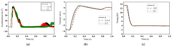 The dynamic characteristics of the landing system under different landing attitudes: (a) Comparison of the lander’s acceleration. (b) Comparison of the lander’s velocity. (c) Comparison of the lander’s mechanical energy.