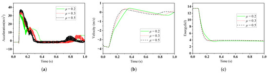 The dynamic characteristics of the landing system under different friction coefficients: (a) Comparison of the lander’s acceleration. (b) Comparison of the lander’s velocity. (c) Comparison of the lander’s mechanical energy.