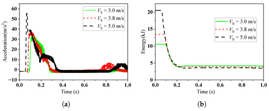 The dynamic characteristics of the landing system under different velocities: (a) Comparison of the lander’s acceleration. (b) Comparison of the lander’s mechanical energy.