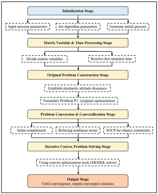 While research on uncertainty in spacecraft attitude alignment problems remains limited, optimization methodologies for uncertainty-involved problems in random systems are already well-established in other fields [,,,,,]. Zhang proposed the chance-constrained sequential convex programming (CC-SCP) algorithm [], which designs a smooth and differential approximation function to transform chance constraints into constraints capable of being handled by a convex optimization method and proves the feasibility of the exact convex relaxation. Szmuk et al. [] proposed a continuous convexification algorithm for the fuel-optimized power landing problem under aerodynamic drag and a new type of nonconvex control constraints including free terminal time. Successive convexification reformulated the problem into a series of iterative second-order cone programming (SOCP) problems [,,,] to estimate the time of flight. These problems are solved with an interior point method (IPM) solver, and reliable convergence is typically achieved in only a few iterations. Ridderhof [] modeled the spacecraft dynamics as a stochastic system, solving optimal trajectories and feedback laws under state mean and covariance constraints [,], and solving the optimal control problem with robustness to disturbances.