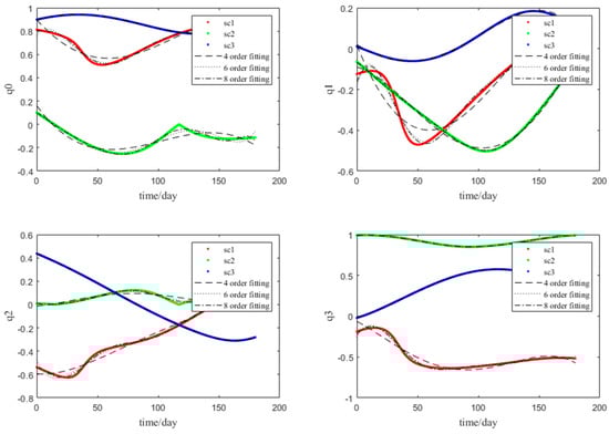 Based on the reference orbit of the spacecraft formation, the relative attitude angles between the payloads (optical components) of the spacecraft formation and the corresponding terminal quaternions can be calculated. During the spacecraft attitude alignment process considered in this paper, only the pitch angle and yaw angle need to be considered in relation to changes in Euler angles. Figure 2 shows the time-dependent changes in the relative attitude angles between the payloads of the two spacecraft. By calculating the corresponding quaternions from the relative attitude angles, the time-varying terminal quaternions are then fitted as a polynomial function of time. Figure 3 illustrates the results of fitting the time-varying quaternions using polynomials of different orders. The time-varying terminal quaternion curve with the best fitting performance is selected as the constraint condition for the spacecraft’s terminal quaternions.