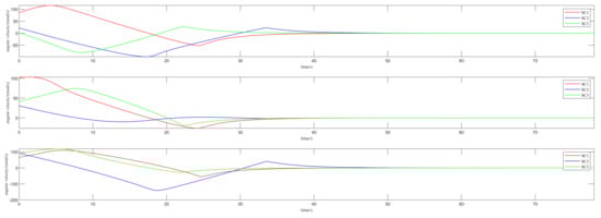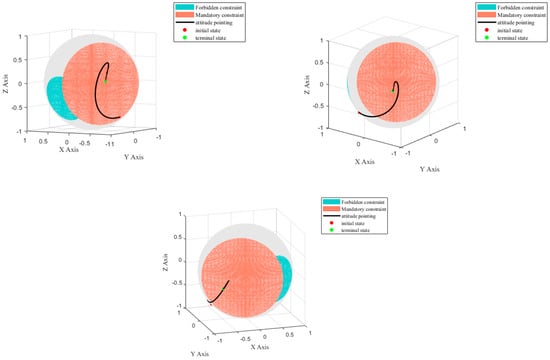The numerical simulation in this paper is based on data measurements from the star tracker (STR) during the establishment of the laser link. The parameters utilized in the algorithm proposed in this paper are presented in Table 2. The duration of attitude alignment affects the initial errors and control difficulty of other sensors in the subsequent gravitational wave detection phase, so it is desirable to achieve the target state more quickly. The initial states of the three spacecraft [] and their corresponding forced constraints and prohibited constraints in space are shown in Table 3. The simulation assumes the presence of three bright targets as prohibitive constraints, each with a field of view half-angle of 30°. The spacecraft’s mission is to align with the other two spacecraft and obtain attitude information. Figure 4 illustrates the three-dimensional attitude pointing of the three spacecraft under the aforementioned pointing constraint conditions. The simulation results demonstrate that the spacecraft can achieve attitude alignment—i.e., adjust its attitude to the terminal state at the corresponding time—while satisfying the constraints.