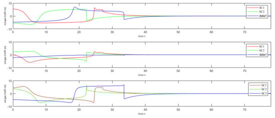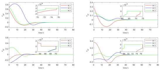 During the establishment of the laser link, two primary sources of uncertainty were considered: solar radiation pressure and microthruster noise errors. These are treated as Gaussian-distributed random terms in a linear random system, with mean and covariance values of 1 μN, 0.1 μN, and 0.1 (μN)2, 0.01 (μN)2/√Hz, respectively. The maximum torque that the microthruster can provide during attitude adjustment is 7 mN. Attitude alignment between spacecraft is achieved through feedback control. The changes in thruster thrust torque and spacecraft angular velocity during attitude alignment are shown in Figure 5 and Figure 6. When the spacecraft formation attitude alignment is complete, the relative angular velocity between spacecraft should be 0. Figure 7 specifically shows the changes in the error quaternion over time during the attitude alignment process. It can be seen that the spacecraft attitude reaches a steady state within 80 s, achieving alignment. The steady-state spacecraft state meets the alignment accuracy requirement of 10−6 rad. As shown in the enlarged section of Figure 7, the simulation results meet the attitude error constraint requirement. According to the termination criterion of the convex optimization problem, the optimization process is terminated once the attitude error falls below the preset tolerance value and the optimization objective is achieved. Consequently, no new error calculation results are produced after the solver ceases iteration.