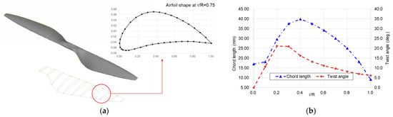 The propeller used in the simulation is a two-blade configuration with a diameter of 18 inches (457.2 mm) and a pitch of 6.5 inches (165.1 mm). The blade has a tapered planform, with a maximum chord length of 39.8 mm located at r/R = 0.4 and a tip chord length of 9.1 mm where R is propeller radius and r denotes the radial position along the blade. The blade twist angle is designed to be 21° in the r/R = 0.2~0.3 region, gradually decreasing to 6.2° at the tip as shown in Figure 1a,b. The airfoil section at r/R = 0.75 has a maximum camber of 5% at 40% of the chord and a thickness-to-chord ratio of 12% as shown in Figure 1a. The solidity of the propeller is 0.07764 where the solidity is defined as Equation (1).