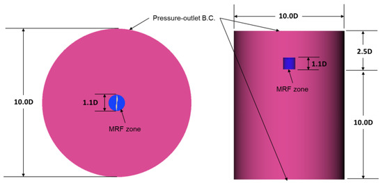 The rotational effects of the propeller were modeled using the Multiple Reference Frame (MRF) technique. In this approach, the rotating domain containing the propeller blades is treated as a steady rotating frame, allowing the centrifugal and Coriolis forces to be incorporated as source terms. This methodology enables efficient and accurate evaluation of steady-state propeller aerodynamics without the computational expense associated with fully transient sliding mesh method [14,15,22]. The size of the MRF domain was set to 1.1D in both the radial and axial directions as shown in Figure 2.