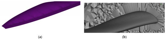 A viscous layer mesh was generated to ensure precise near-wall resolution. The first cell height was determined to achieve at 75% of the propeller radius (r/R = 0.75) under a rotational speed of 3000 rpm, yielding a value of 0.007 mm. A total of 25 viscous layers were generated to ensure a smooth transition from the near-wall boundary layer mesh to the isotropic volume mesh as shown in Figure 4a,b.