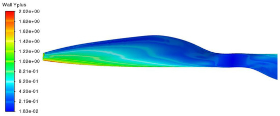 Figure 5 presents y+ distribution over the propeller surface at the rotating velocity of 3000 rpm. It is observed that the y+ < 1 criterion is maintained across the propeller surface, except in localized regions near the leading edge and blade tip, confirming that the suitability of the mesh for accurate SST k–w turbulence modeling.