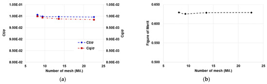 To ensure mesh independence, a sensitivity study was performed using four mesh densities ranging from approximately 7.5 to 22.5 million cells. During the mesh sensitivity study, the surface and boundary layer meshes were kept constant, while the size and distribution of the isotropic cells in the flow domain were varied. Figure 6a presents thrust (), torque coefficient () normalized by solidity () and Figure 6b shows the Figure of Merit (FoM) obtained with different mesh densities.