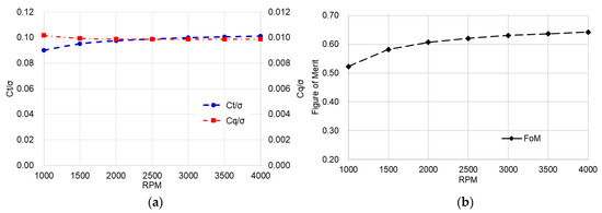 At 3000 rpm, which corresponds to the normal operating condition of the propeller, the normalized coefficients were approximately and FoM = 0.63.