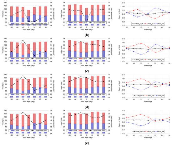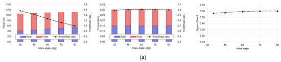 Figure 8 presents the thrust, torque, and FoM under various offset distances and index angles. The FoM of each propeller FoM_up, FoM_low was calculated using Equation (4), while the FoM of the CCR system (FoM_CCR) was evaluated using Equation (5), as proposed by Leishman [23], where the subscripts l and u denote the lower and upper propellers, respectively. The corresponding values of and are presented in Figure 9.
