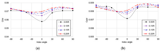 Figure 14 compares the FoM of the CCR system across various offset distances and index angles. While the maximum thrust of the CCR system occurs near an index angle of 60° as shown in Figure 9, the maximum FoM is observed at an index angle of 90°. Overall, the FoM increases with increasing offset distance with positive index angle, showing an approximate 17.3% improvement, from 0.394 (offset distance of 0.05R, index angle of 0°) to 0.462 (offset distance of 0.20R, index angle of 90°). The sensitivity of the FoM to the index angle tends to decrease as the offset distance increases. Specifically, when the offset distance is 0.05R, the FoM varies by approximately 12.2%, increasing from 0.394 at an index angle of 0° to 0.442 at an index angle of 90°. In contrast, with an offset distance of 0.20R, the FoM changes by only about 1.5%, from 0.455 at an index angle of 0° to 0.462 at 90°. Therefore, it is advantageous to maximize the offset distance within the allowable structural rigidity and layout constraints of the CCR system, while the optimal index angle can be selected based on the specific design objectives for thrust and FoM.