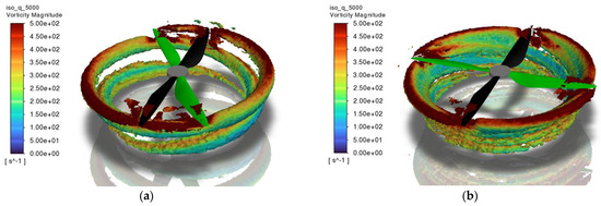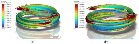 Tip vortex trajectory by iso-surfaces of Q-criterion at a value of 5000 for an offset distance of 0.20R colored by vorticity magnitude: (a) index angle of –30°; (b) index angle of 60°.