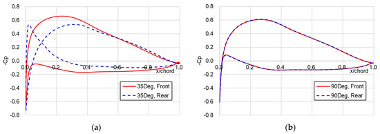 This trend is also evident in the sectional pressure coefficient (Cp) distributions at r/R = 0.9 along the blade radius, as shown in Figure 11. At an index angle of 35°, the pressure distribution on the rear blade produces lower thrust compared with that on the front one. In contrast, at an index angle of 90°, the pressure distribution on the rear blade generates greater thrust compared with that at 35°. Moreover, the pressure distributions of the front and rear blades are nearly identical.