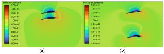 Figure 17 compares the pressure coefficient (Cp) distributions of the upper and lower propellers at the radial location of r/R = 0.75. As shown in Figure 17a, when the upper propeller rotates faster than the lower one, the pressure distribution near the leading edge of the lower propeller exhibits typical characteristics of a negative angle of attack. This is attributed to a strong downwash flow induced by the upper propeller, which reduces the effective angle of attack for the lower propeller. In contrast, as shown in Figure 17b, when the lower propeller rotates faster, this effect is significantly mitigated, and both propellers exhibit relatively similar pressure distributions.