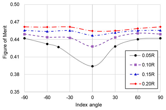 Comparison of Figure of Merit for various offset distances and index angles at a rotating velocity of 3000 rpm.