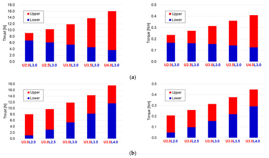 Comparison of thrust and torque for various rotating speeds at an offset distance of 0.20R: (a) lower 3000 rpm, (b) upper 3000 rpm.
