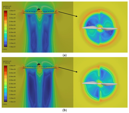 Comparison of Z-direction velocity distributions for different rotating speed combinations: (a) upper propeller at 4000 rpm and lower propeller at 3000 rpm, (b) upper propeller at 3000 rpm and lower propeller at 4000 rpm.