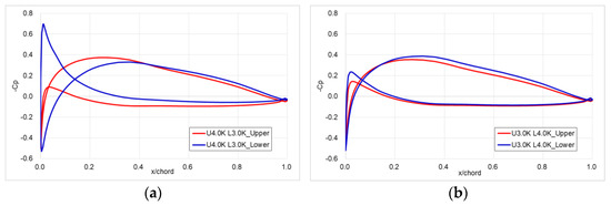 Comparison of sectional Cp distributions for different rotating speed combinations: (a) upper propeller at 4000 rpm and lower propeller at 3000 rpm, (b) upper propeller at 3000 rpm and lower propeller at 4000 rpm.