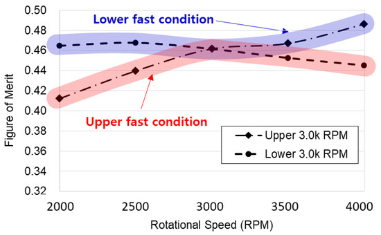 In CCR systems, the rotational speeds of the upper and lower propellers are also a critical design parameter. Accordingly, aerodynamic analyses were conducted to evaluate their influence on overall system performance by varying the rotational speeds. The simulations were conducted at an offset distance of 0.20R, where the highest Figure of Merit (FoM) was consistently achieved across all index angles, showing little sensitivity to their variation. In these cases, the rotational speed of the upper propeller was fixed at 3000 rpm, while the lower propeller speed was varied from 2000 to 4000 rpm in increments of 500 rpm, and vice versa. The results are presented in Figure 15.