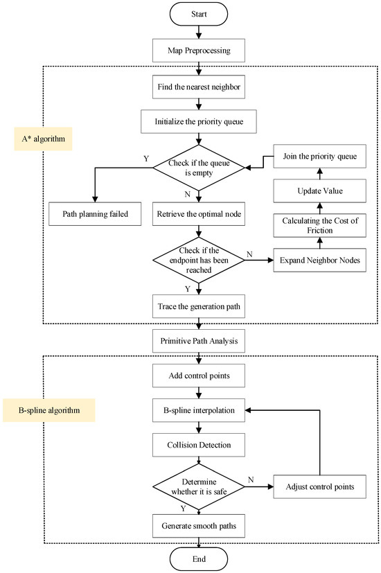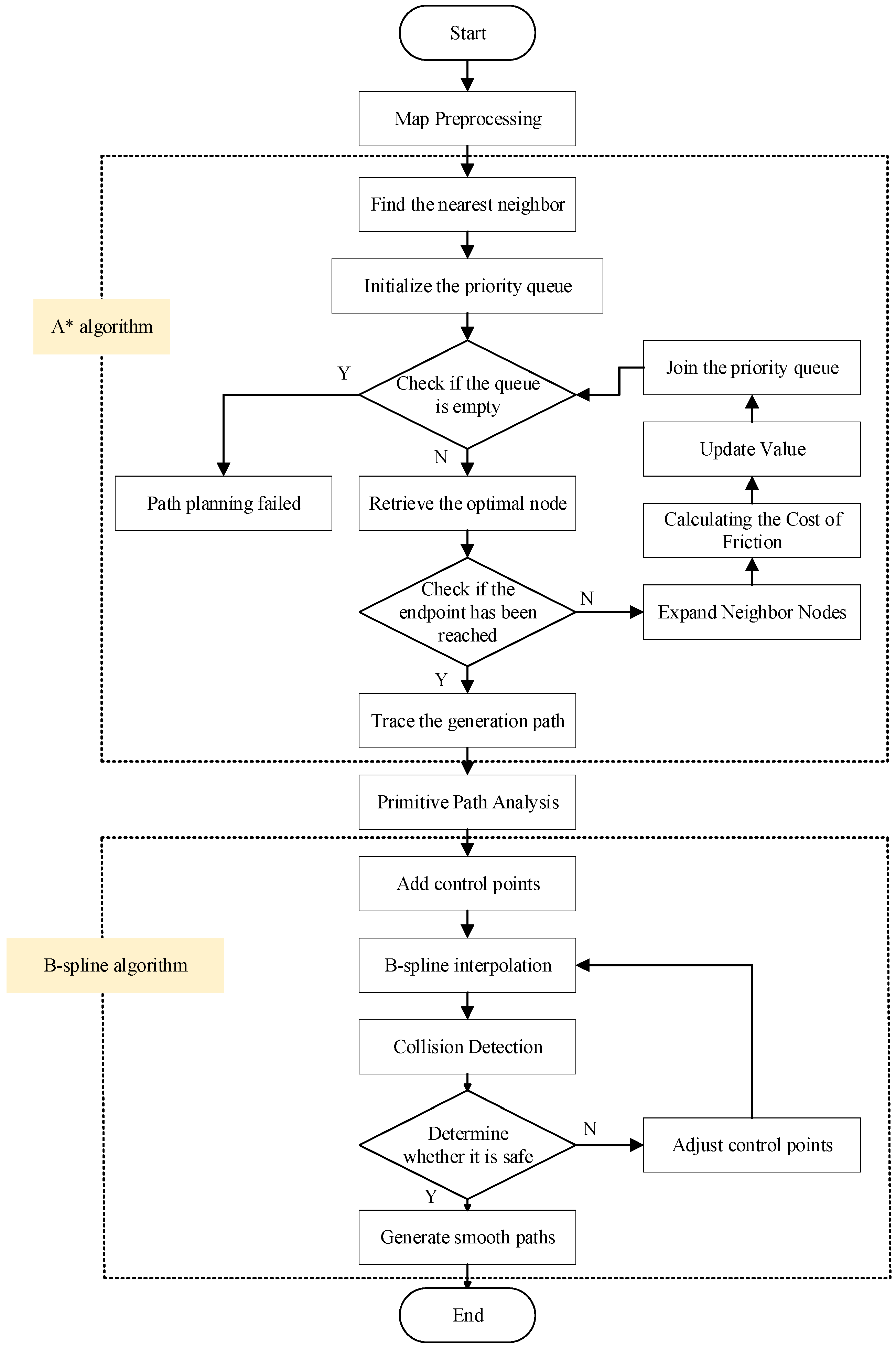 23] integrated an improved A* algorithm with piecewise quadratic Bézier curves. By adjusting the search neighborhood and introducing a dynamic weighted heuristic function, they effectively reduced redundant nodes and runtime. Building upon this, Bézier curves were applied to smooth the path, further optimizing the planned path in terms of curvature and length. However, compared to polynomial interpolation curves and Bézier curves, B-spline curves offer superior local controllability and numerical stability. They effectively mitigate oscillation issues associated with higher-order curves while ensuring continuity in position, velocity, and acceleration along the path. Zhang [