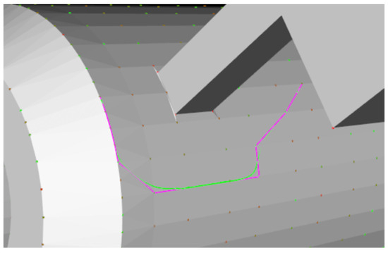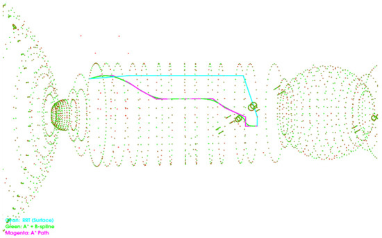 Figure 13, where purple represents the traditional A* algorithm, green represents the A*-B-spline hybrid algorithm, and cyan represents the RRT surface path planning algorithm. A quantitative comparison of the key performance metrics for the three algorithms is presented in