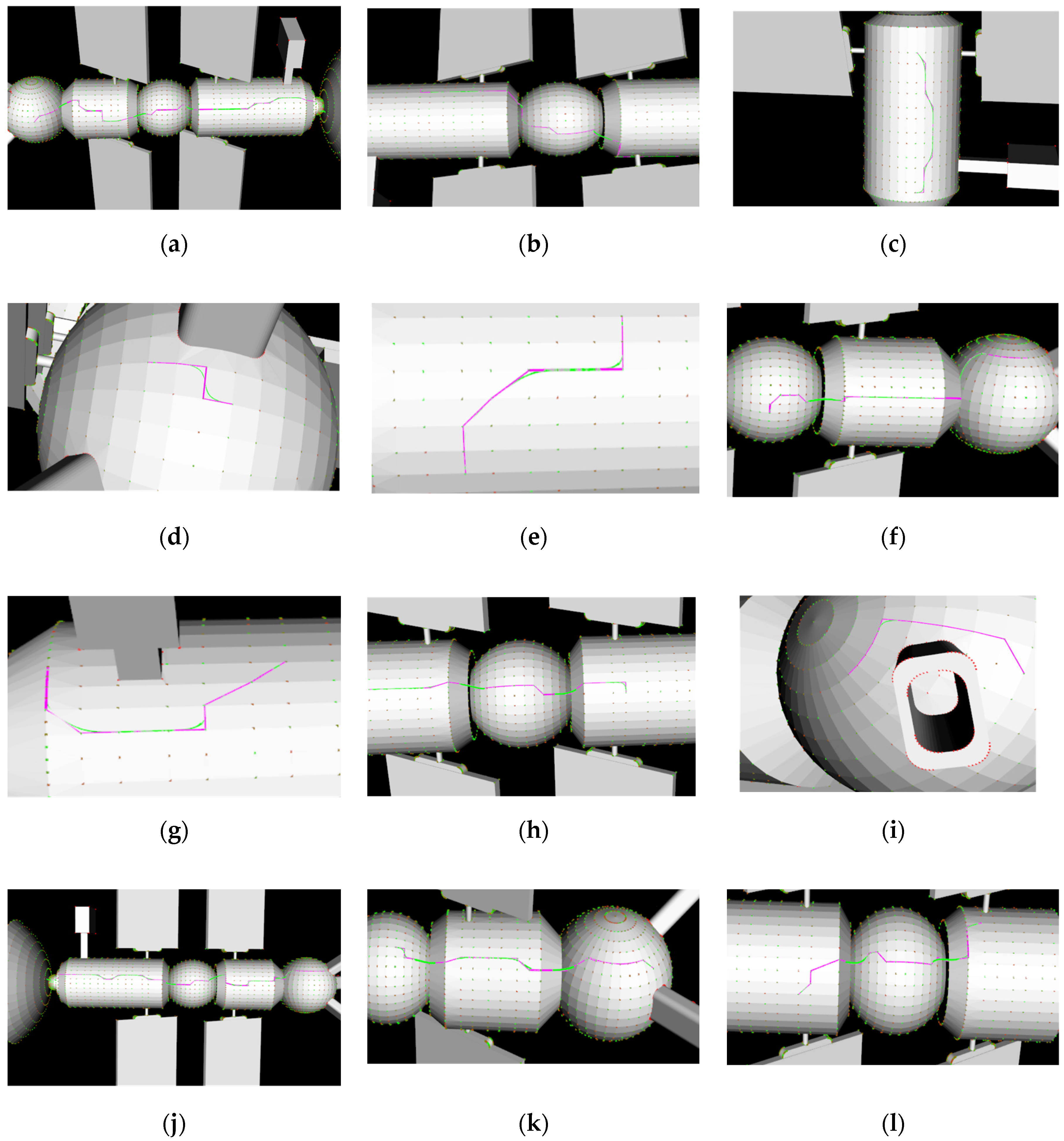 This section systematically compares the A* algorithm with the improved A*-B spline hybrid algorithm based on 12 typical path planning cases and dataset results. The experiments utilize a high-precision satellite 3D model incorporating typical components such as parabolic antennas and solar panel arrays. The model surface is constructed into a point cloud map through ordered sampling with a density of 200 pts/m