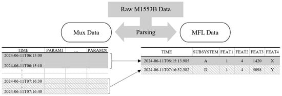 Since MUX data and MFL data are extracted separately from M1553B data for use, mapping between the used MUX data and MFL data is necessary. During the extraction process, data is parsed by communication packets, and each packet has different characteristics; not all data is recorded at the same time. In this study, MUX data was segmented into regular units to create sequences, and MFL data that occurred within the time period of those sequences was mapped and utilized. A detailed example can be found in Figure 2.
