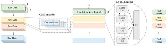 CNN is a model that effectively extracts local features by introducing convolution operations to the basic feed-forward neural network structure. This study utilized 1D CNN to capture short-term patterns or changes in data on the same time-series axis. Since kernel parameters are reused across all data, learning occurs faster due to fewer parameters compared to other model structures. The CNN encoder consists of two convolutional layers and ReLU layers between them. Convolutional layers extract local features of data. Since it is difficult to find time-series characteristics in approximately 1 s data, the model was configured so that time-series characteristics are not reflected in this layer. Additionally, to preserve data features as much as possible, pooling layers were not used, and ReLU activation functions were placed between convolutional layers to increase nonlinearity. The data input to CNN is configured in the shape [N, S, T, P], where T is a parameter that determines how many rows the CNN encoder will compress in total. In this study, T was set to the max frequency of the used data to enable the extraction of approximately 1 s features from the data. P is the number of input parameters, and this study utilized a total of 20 parameters. S is a dimension created to extract features of longer sequences in the LSTM layer, and learning in this encoder proceeds regardless of the S dimension. That is, [S, T, P] represents data for one section, and N indicates how many such data sections exist. The output data is converted to [N, S, H], where H is the output dimension of the CNN encoder.