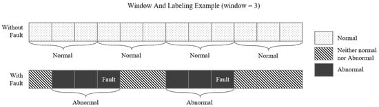 In fault-free flights, all maneuvers were extracted and defined as normal maneuvers (labeled as 0). Conversely, flights with faults are divided into abnormal maneuvers (labeled as 1) and unlabeled maneuvers. Abnormal maneuvers are defined as maneuver sections including the time point when the fault occurred and preceded by the window size, while other sections remain unlabeled. That is, all unlabeled maneuvers are not used for training and are discarded. This is because it is difficult to identify specifically what duration of maneuvers before a fault in a flight with faults should be considered normal maneuvers, making it difficult to determine what duration before the fault should be viewed as normal maneuvers. The specific labeling process is as follows: