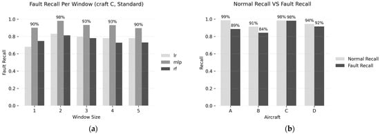 Additionally, comparing the distributions of Normal Recall and Fault Recall shows that learning was not over-fitted to fault occurrence. Through this, it was demonstrated that there are likely specific maneuver features for each aircraft that cause FCR faults. In Figure 7b, showing Normal Recall and Fault Recall for each craft when using the MLP model, window 2 showed the best performance, and Normal Recall is confirmed to be close to nearly 100%. As shown in Table 4, not only Fault Recall but also other evaluation metrics like Accuracy and Precision recorded high scores, meaning this methodology learned well to predict only actual faults without overfitting to fault positives. This proves it is reasonable to view that each aircraft has specific maneuver features that cause FCR faults.