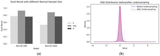 To validate potential information loss from undersampling normal data, the following verification experiments were conducted. The experimental results validating the appropriateness of normal data undersampling are as follows. As shown in Figure 8a, the comparison of model performance using 500 versus 1000 Normal Samples demonstrates that Fault Recall remains consistently high without significant degradation. Across all models (LR, MLP, RF), the difference in Fault Recall between the two conditions was less than 5%, confirming that 500 Normal Samples contain sufficient information for fault detection without performance loss. The KDE distribution analysis in Figure 8b reveals that the data distributions before and after undersampling are nearly indistinguishable, with curves overlapping closely. This indicates that the distributional characteristics of normal data were well preserved despite random undersampling. These results demonstrate that the undersampling strategy adopted in this study effectively addresses the data imbalance problem while minimizing information loss.