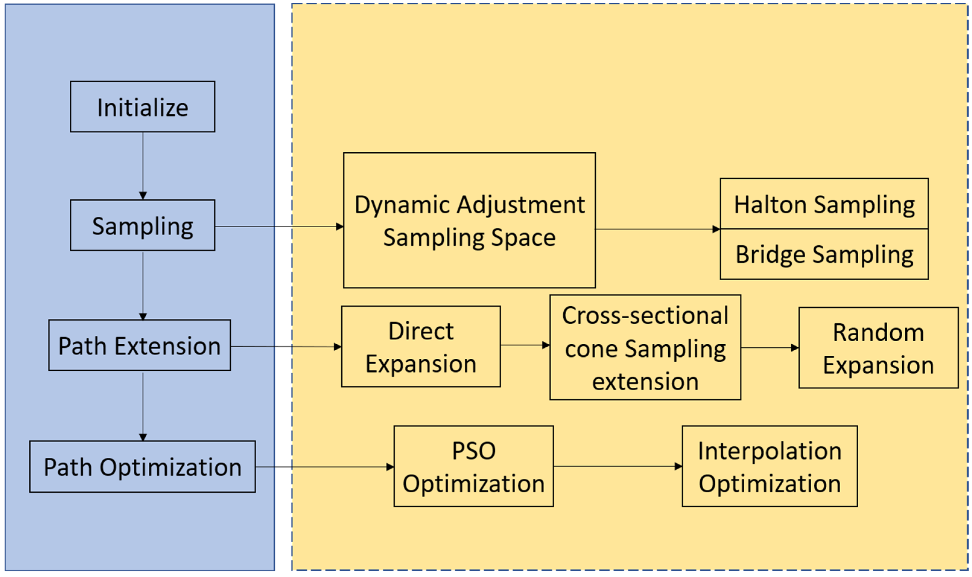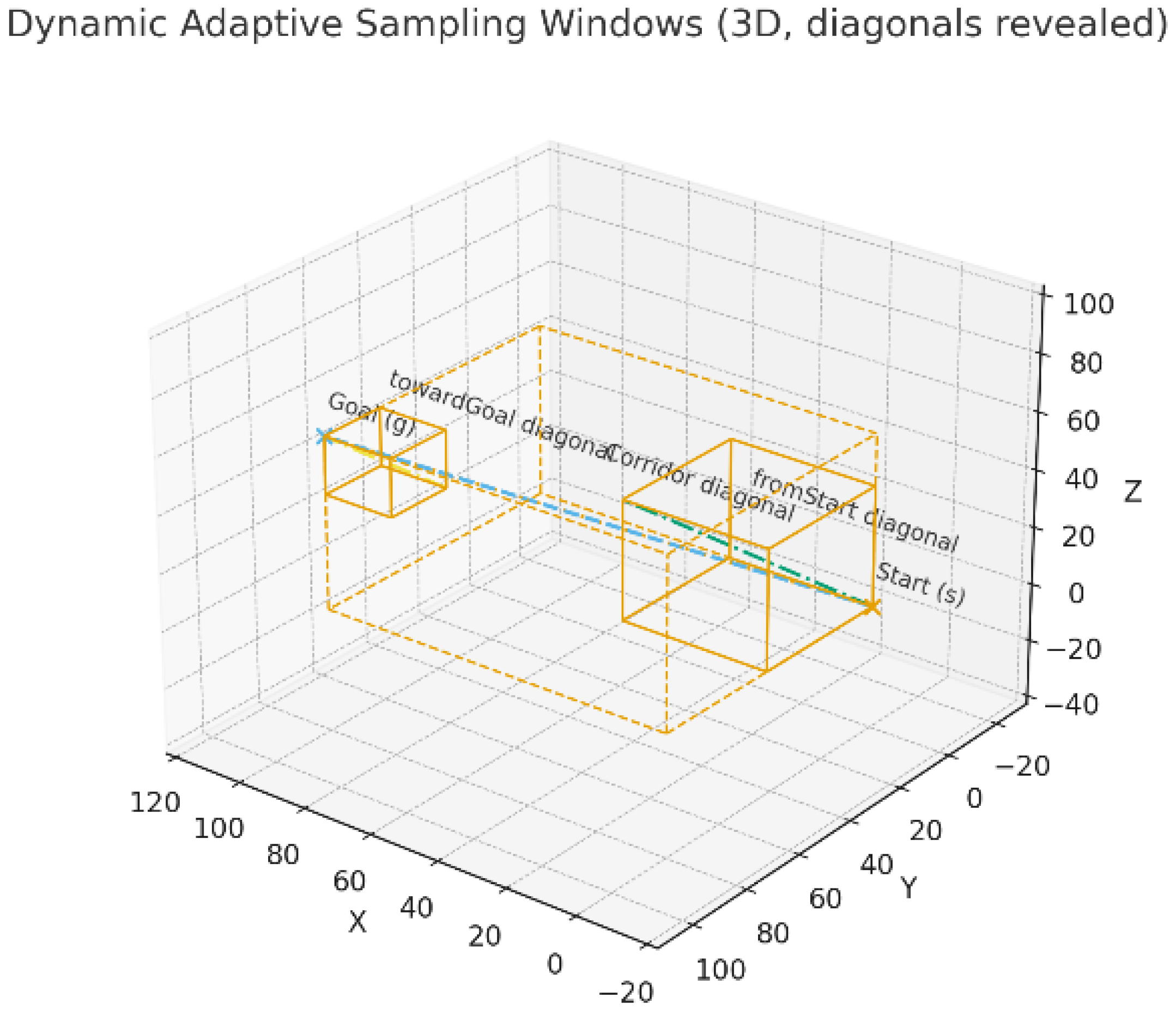 - We propose dynamically adjusting the sampling space before expansion. Compared with using the global space, this dynamic adjustment narrows the sampling domain and reduces invalid samples and futile expansions. Guided by search progress and the urban modeling context, we shrink or re-define the sampling region so that samples concentrate in areas more likely to yield feasible paths, thereby reducing low-value points.