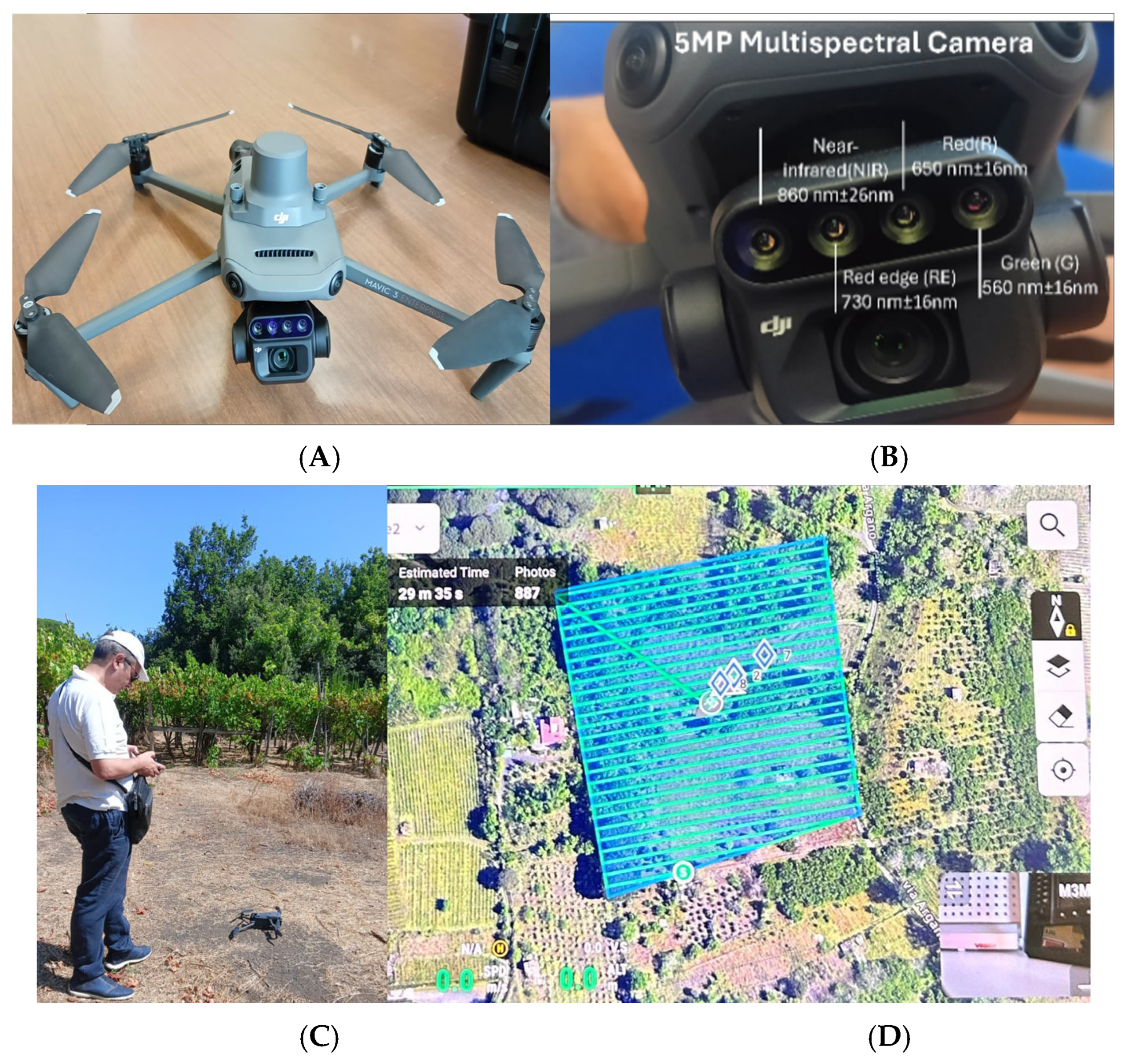 - DJI-Mavic-3M-Guide-1. Available online: https://dl.djicdn.com/downloads/DJI_Mavic_3_Enterprise/20221216/DJI_Mavic_3M_User_Manual-EN.pdf (accessed on 25 April 2024).