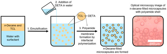 Depiction of the preparation process of n-decane-filled polyamide microcapsules (left) and optical microscopy images of the capsules in water (right, 150 µm average diameter).