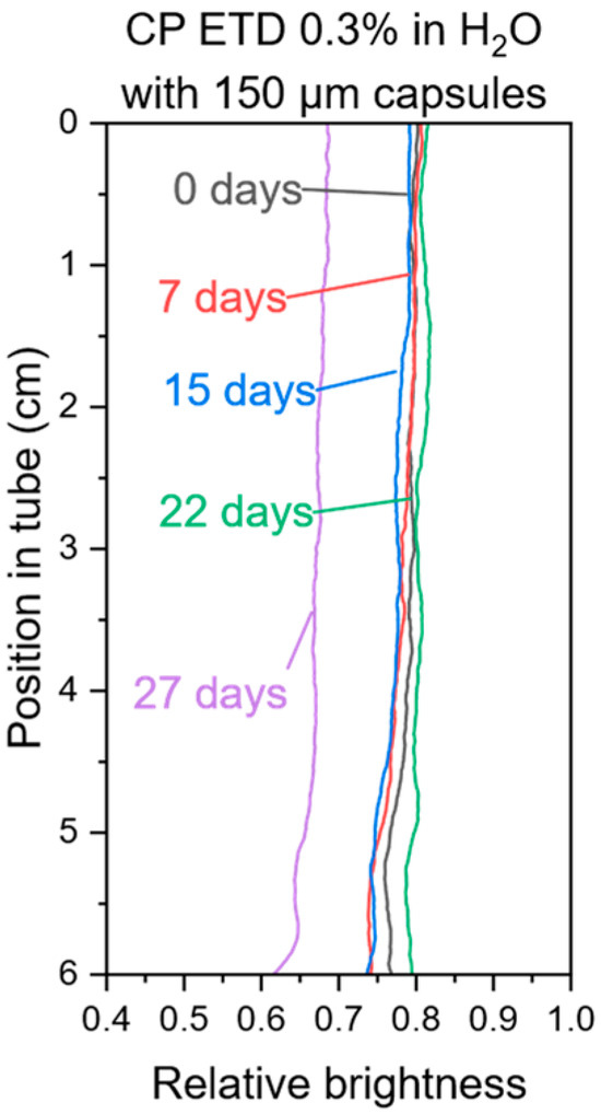 Brightness distribution of a long-term storage test of a 0.3% CP ETD–water gel with 150 µm microcapsules.