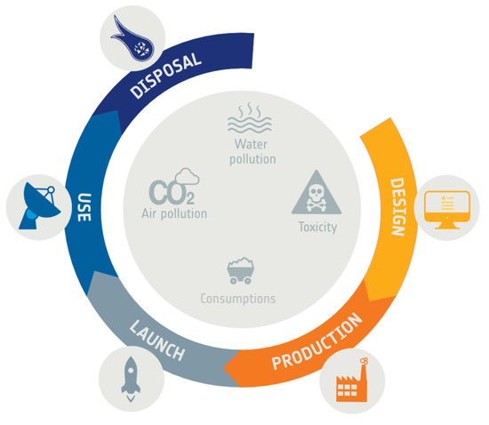 - Delaval, J. CleanSpace Webinar: EcoDesign at ESA. CleanSpace Blog. 5 June 2020. Available online: https://blogs.esa.int/cleanspace/2020/06/05/cleanspace-webinar-ecodesign-at-esa/ (accessed on 20 February 2025).