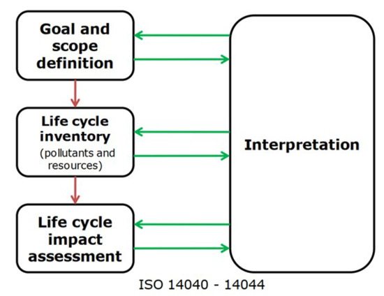 Life Cycle Assessment is a standardized and systematic method used to evaluate the potential environmental impacts of a product or system across its entire life cycle. According to ISO 14044, the LCA process is made of four main stages: (1) goal and scope definition, (2) inventory analysis, (3) impact assessment, and (4) interpretation that are illustrated in Figure 4.
