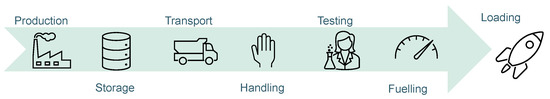 - The life cycle inventories are modeled using a cradle-to-gate approach, including the inputs of materials and processes required for the different components and chemicals that constitute the propulsion system. The defined system boundaries cover all relevant stages up to launcher integration, including production, transportation, testing, storage, handling, and fueling operations. The specific processes involved in propellant loading are illustrated in Figure 6, while Figure 9 presents the system boundary applied to the overall propulsion system modeling.